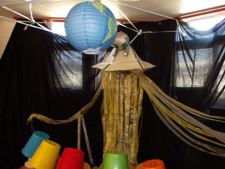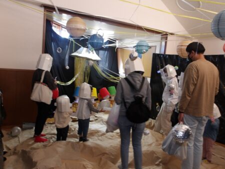 月面には宇宙人の子どもが逃げていて、みんなで協力をして家族のもとに返してあげました。