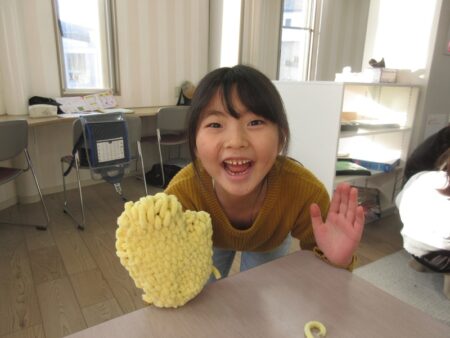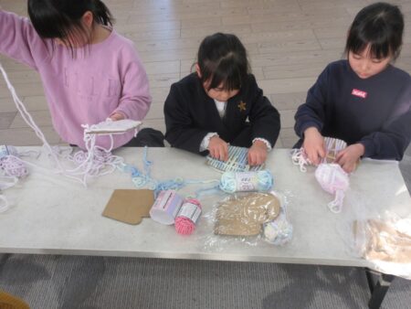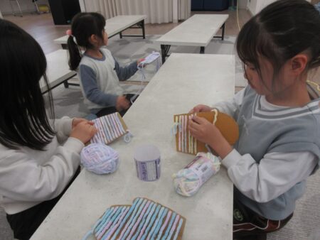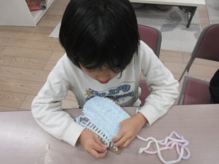 自分の好きな毛糸を選び、ダンボールの手形に巻き付けながら手袋づくりに挑戦しました。