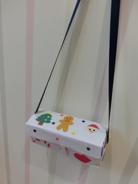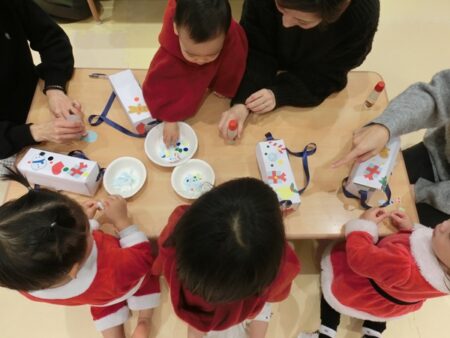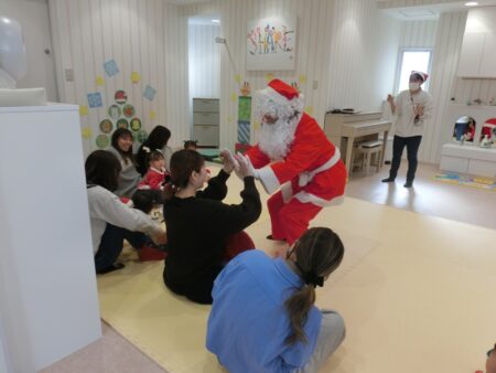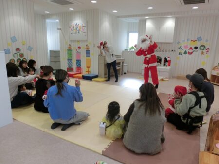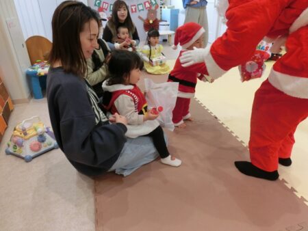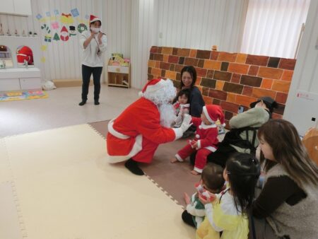 TOP > 子育て支援センターみなみ ブログ > クリスマス会 子育て支援センターみなみ ブログ KOSODATE SHIEN CENTER MINAMI BLOG クリスマス会 12月18日(木)にクリスマス会を開催しました。 牛乳パックで作ったかばんに、サンタさんや靴下、ベルやツリー型の手作りのオーナメントをのりで貼りました。 「これはどこに貼ろうかな?」と考えながら、上手にのりを使い、とってもかわいいクリスマスのかばんができました。 その後はおまちかねのサンタさん登場!! 一緒にマラカスで「あわてんぼうのサンタクロース」を演奏したり、 シルエットクイズ、サンタさんとハイタッチ、写真撮影など楽しい時間を過ごしました。 最後にはサンタさんから1人づつプレゼントを貰い、みんなニコニコ笑顔で受け取っていましたよ。 2025.12.22