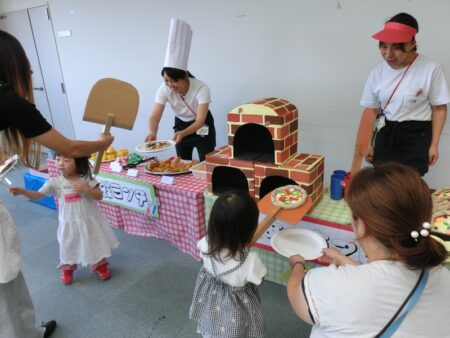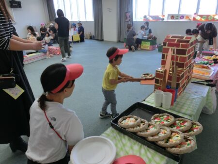 TOP > 子育て支援センターみなみ ブログ > 4館合同お店屋さんごっこ 子育て支援センターみなみ ブログ KOSODATE SHIEN CENTER MINAMI BLOG 4館合同お店屋さんごっこ 10/7(火)、貝塚市の支援センター4館が合同で、お店屋さんごっこを開催しました。 支援センターみなみは『お子様ランチ』と『ピザ』を出店しました。 トングを使って自分の好きな食べ物を挟んでお皿に乗せたり、 窯にピザを入れて「自分でできた!」と満足そうな姿も見られました。 焼きそばやジュース屋さんやアイス屋さんなど、他にもたくさんのお店があり、親子で楽しんでくれていました。 2025.12.01